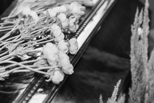 Am Grab steht eine Schale mit Blütenblättern oder kleinen Sträußen bereit, die von den Trauernden als letzten Gruß mit ins Grab gegeben werden können.